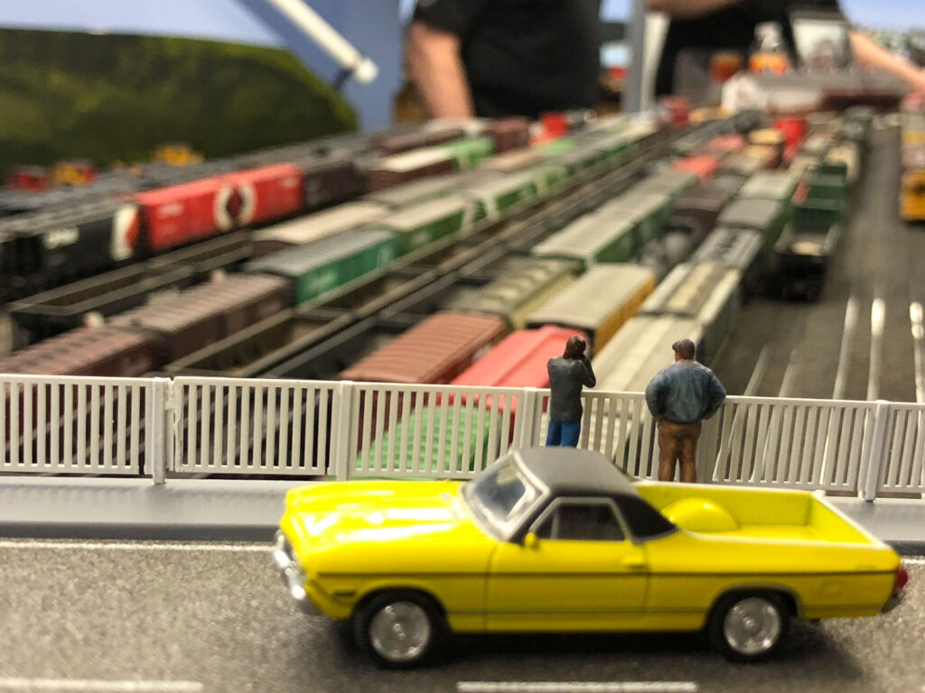 A pair of railfans watch the work at the Sudbury yard. The figure on the right is a 3D printed version of my son Nick!