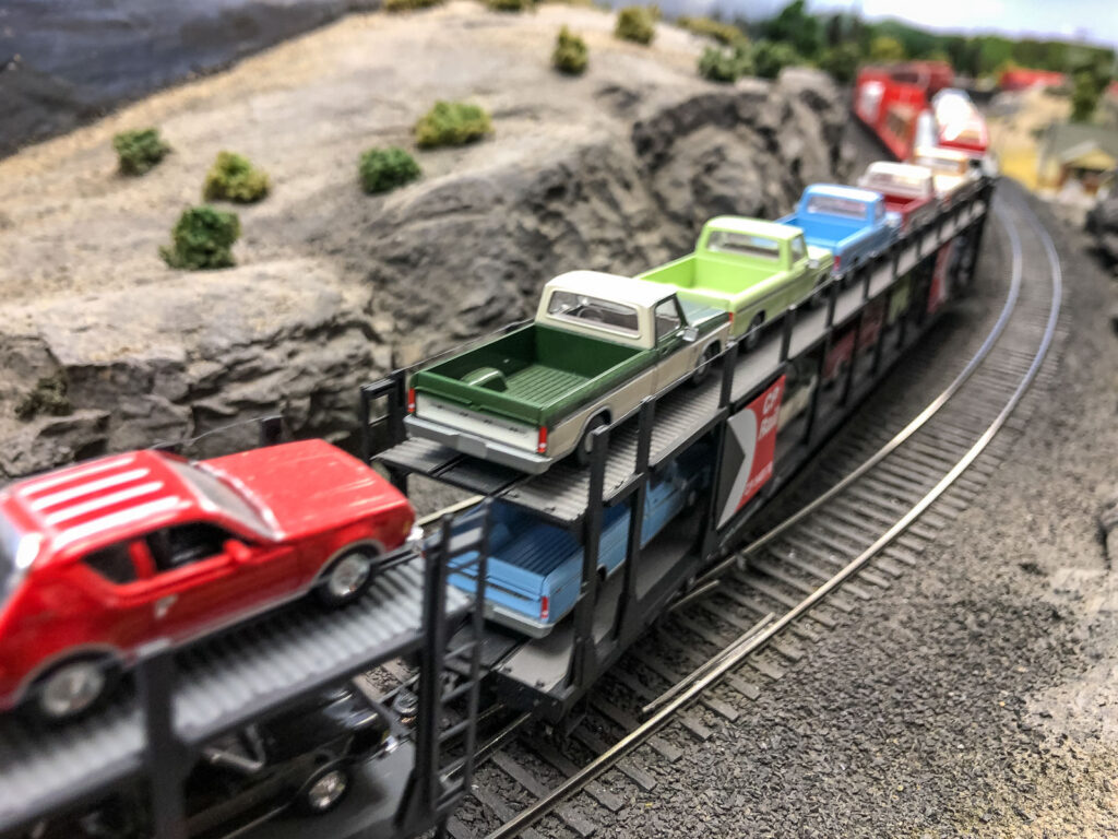 The second train to pass had a collection of open auto racks in the manifest. We all admired these beautiful models carrying beautiful model cars. What a sight!